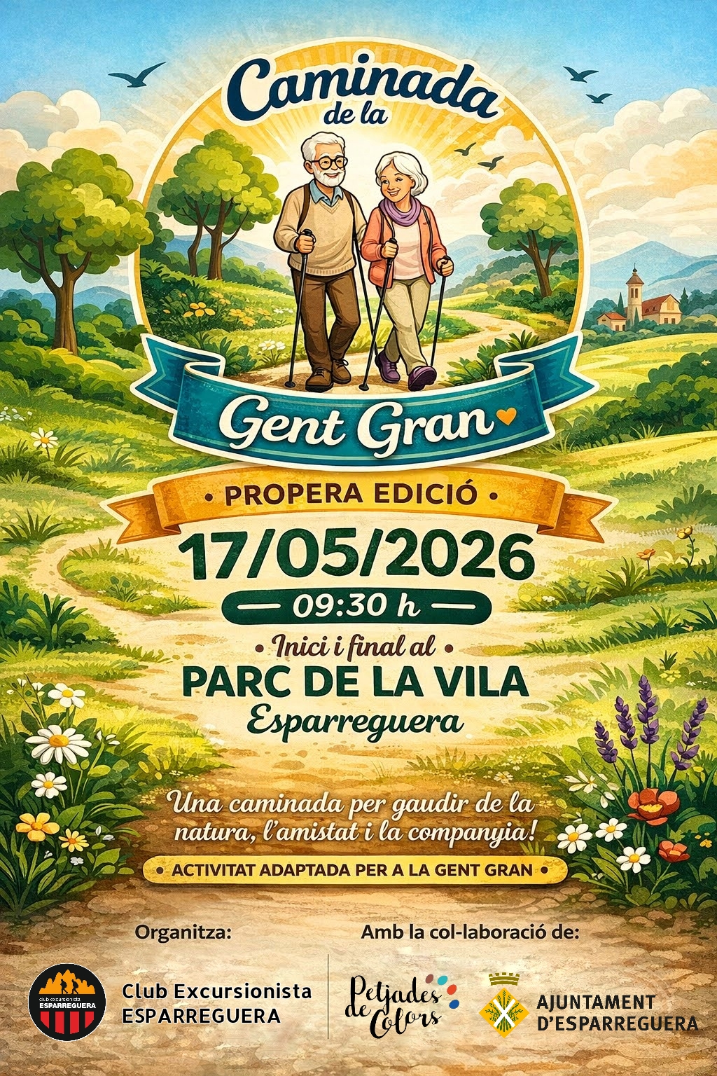 La Caminada de la Gent Gran se celebra el dia 17 de maig, entre les 09:30 i les 13:00 hores, sent el punt d’inici i final el Parc de la Vila, a Esparreguera. A partir de les 09:00 hores es farà recepció dels participants.